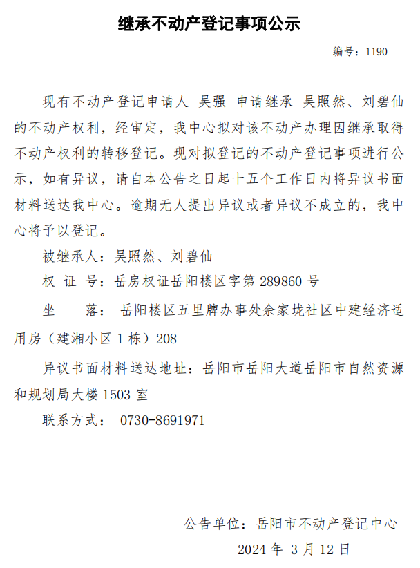 继承不动产登记公示 编号:吴强(1190)