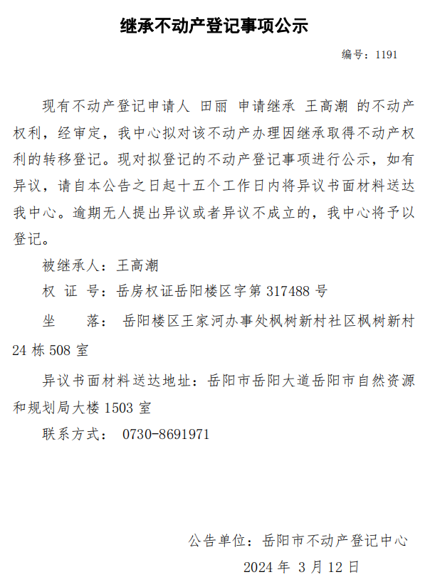继承不动产登记公示 编号:田丽(1191)