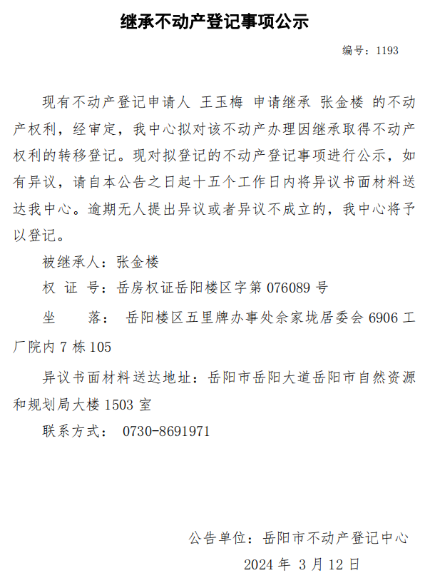 继承不动产登记公示 编号:王玉梅(1193)