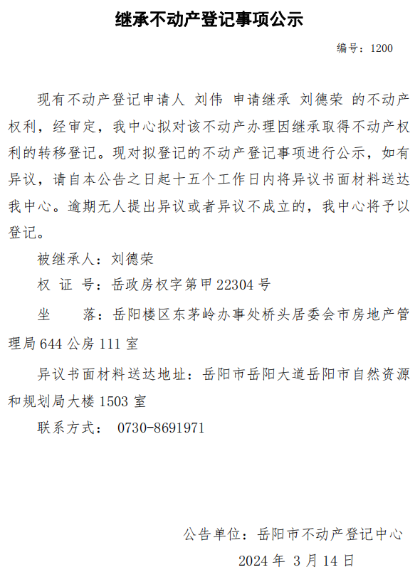 继承不动产登记公示 编号:刘伟(1200)