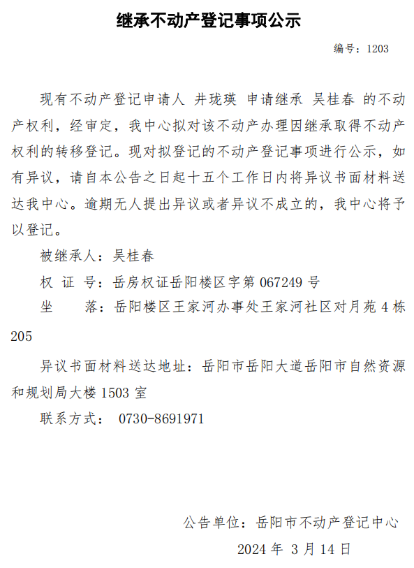 继承不动产登记公示 编号:井珑瑛(1203)