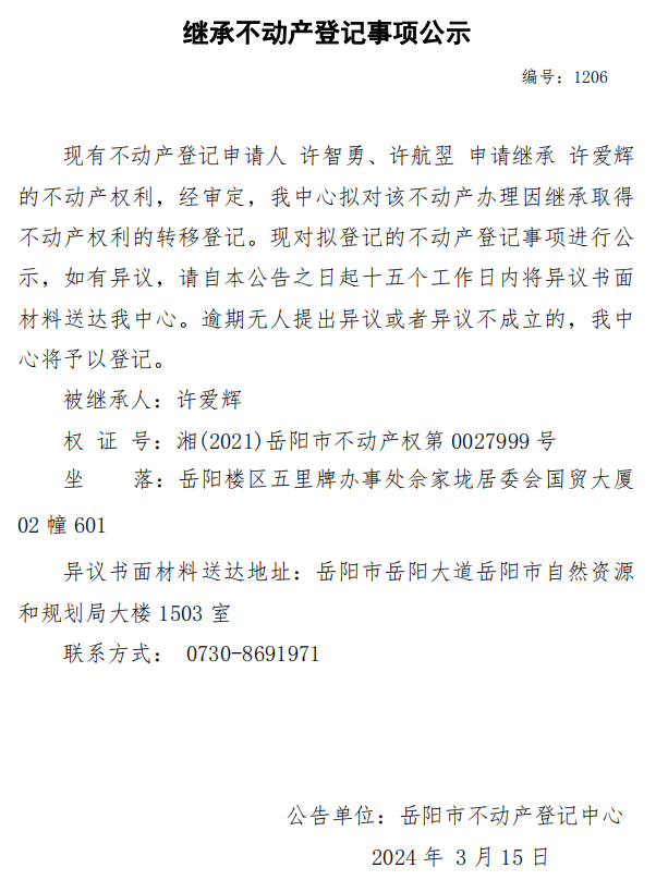 继承不动产登记公示 编号:许智勇、许航翌(1206)