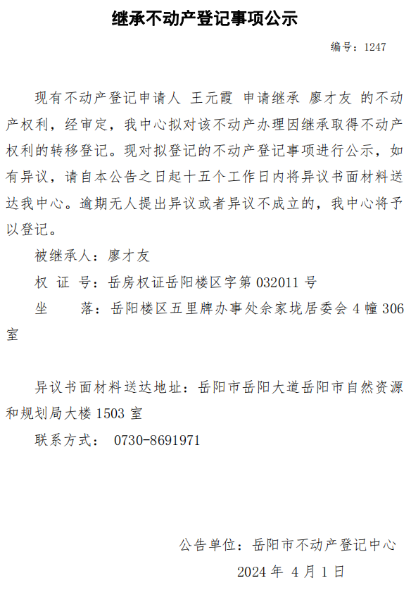 继承不动产登记公示 编号:王元霞(1247)