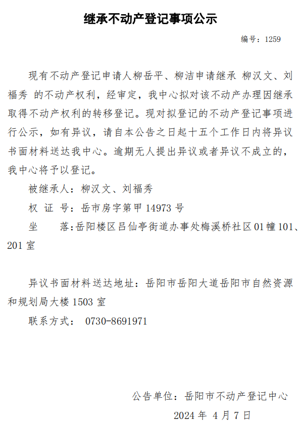 继承不动产登记公示 编号:柳岳平、柳洁(1259)