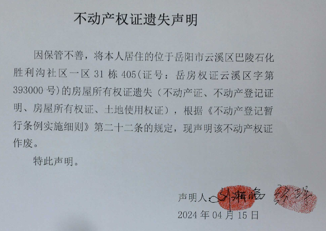 不动产权证书 遗失声明