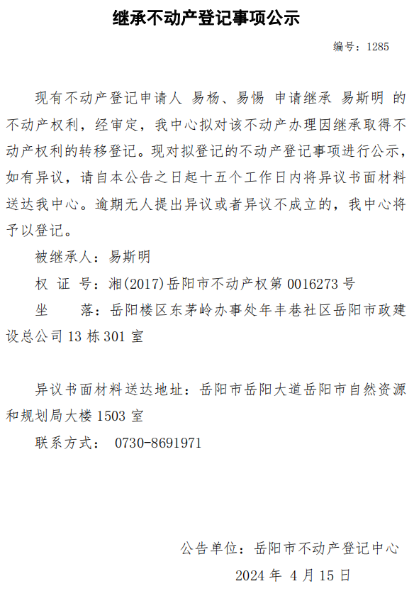 继承不动产登记公示 编号:易杨、易惕(1285)