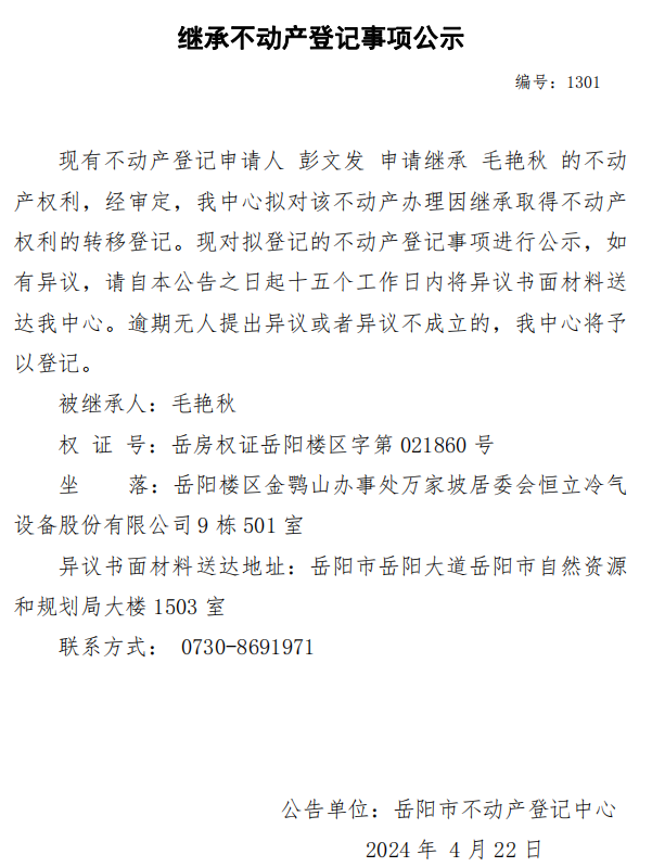继承不动产登记公示 编号:彭文发(1302)