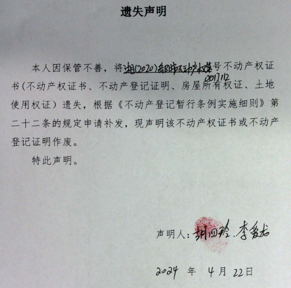 遗失声明(胡四玲、李爱龙)