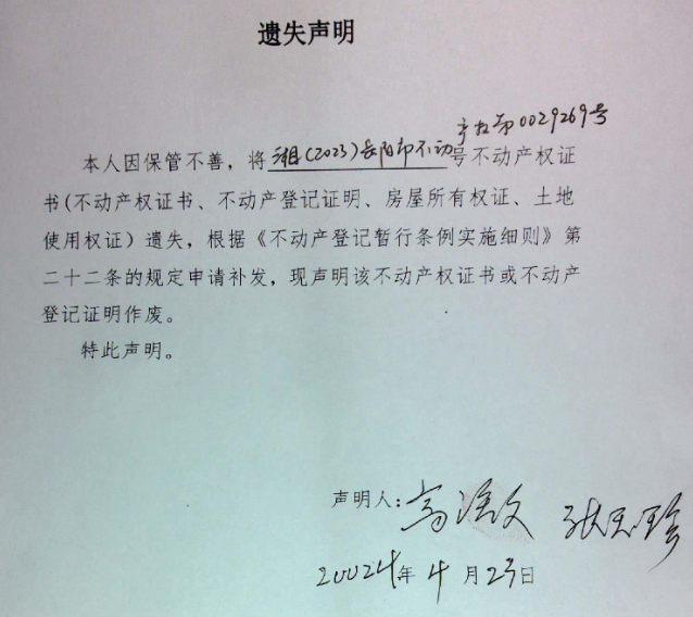 遗失声明(高注文、张玉珍)