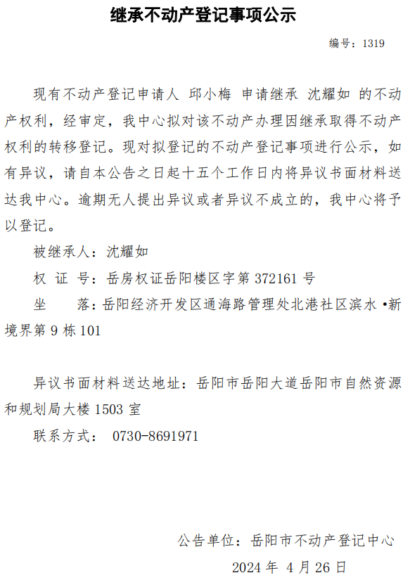 继承不动产登记公示 编号:邱小梅(1319)