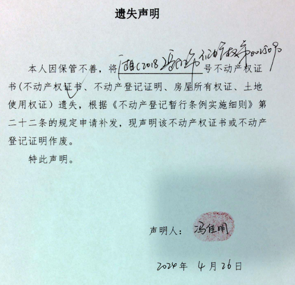遗失声明(冯佳明)
