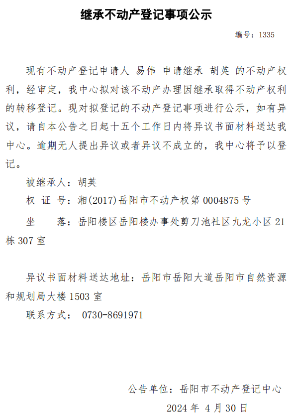继承不动产登记公示 编号:易伟(1335)