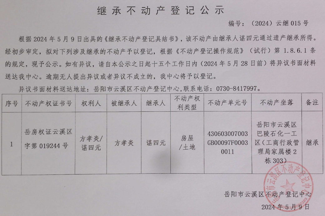 继承不动产登记公示 编号:(2024)云继015号