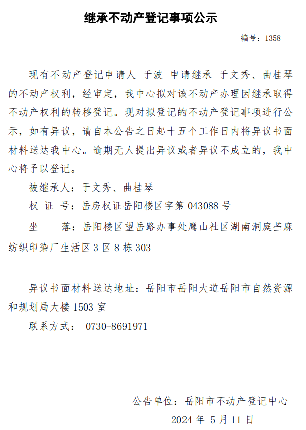 继承不动产登记公示 编号:于波(1358)