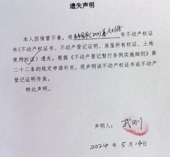 遗失声明(武刚)