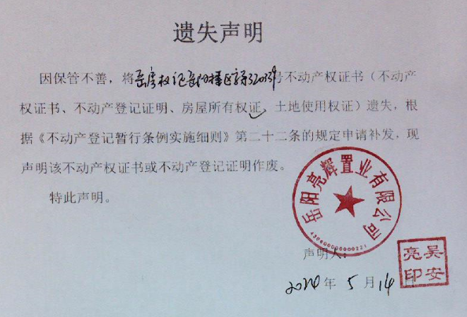 遗失声明(岳阳亮辉置业有限公司)