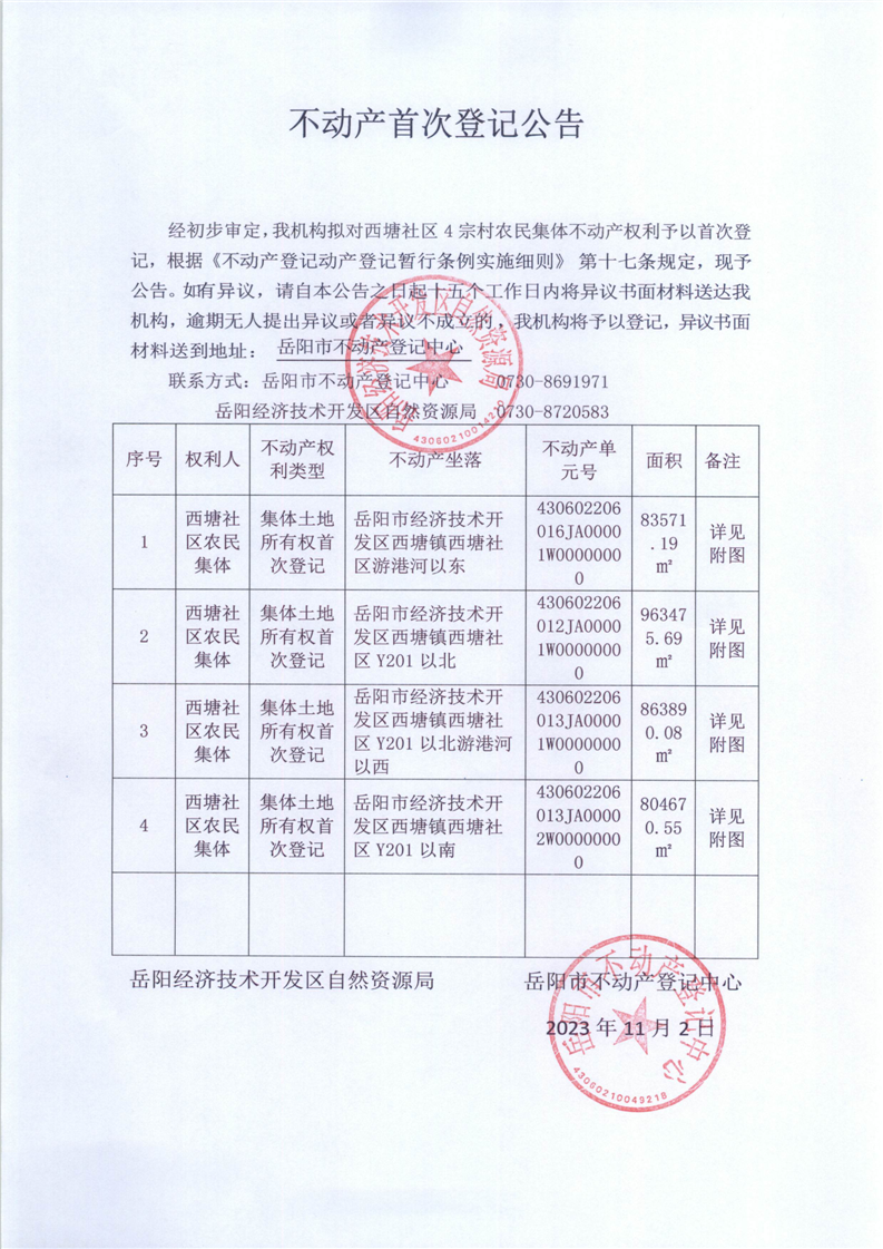 不动产首次登记公告(西塘社区农民集体)