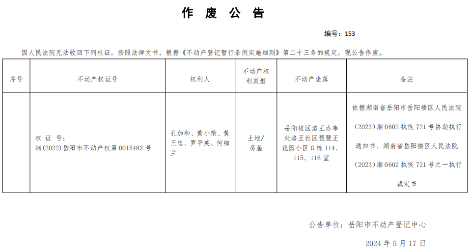 作废公告 编号:孔加和、黄小荣、黄三忠、罗平英、何细兰(153)