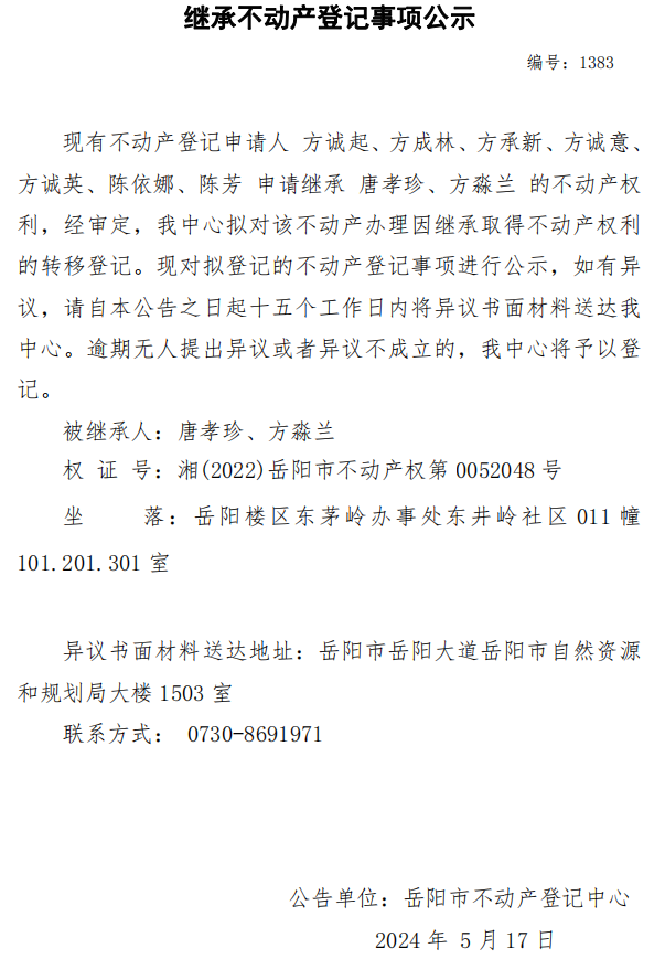继承不动产登记公示 编号:方诚起、方成林、方承新、方诚意、方诚英、陈依娜、陈芳(1383)
