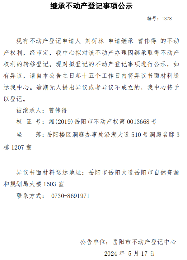 继承不动产登记公示 编号:刘衍林(1378)
