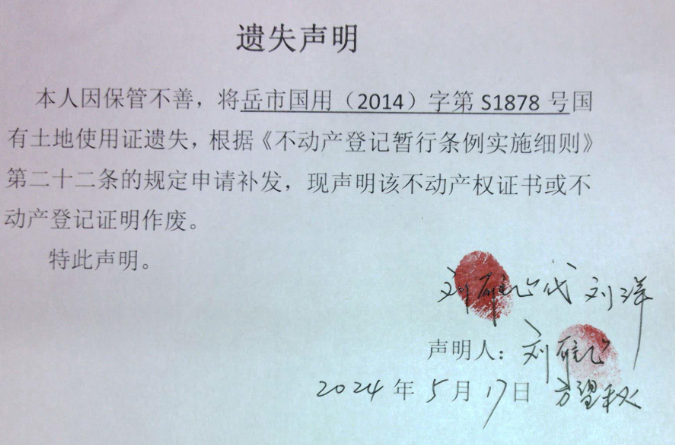 遗失声明( 刘洋、方望秋、刘雁飞 )