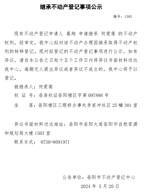 继承不动产登记公示 编号:葛翔(1385)