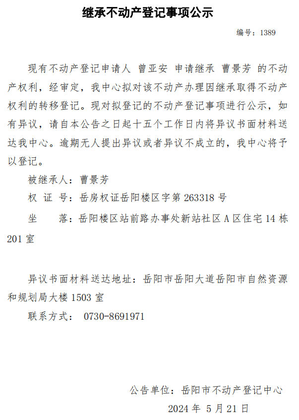 继承不动产登记公示 编号:曾亚安(1389)