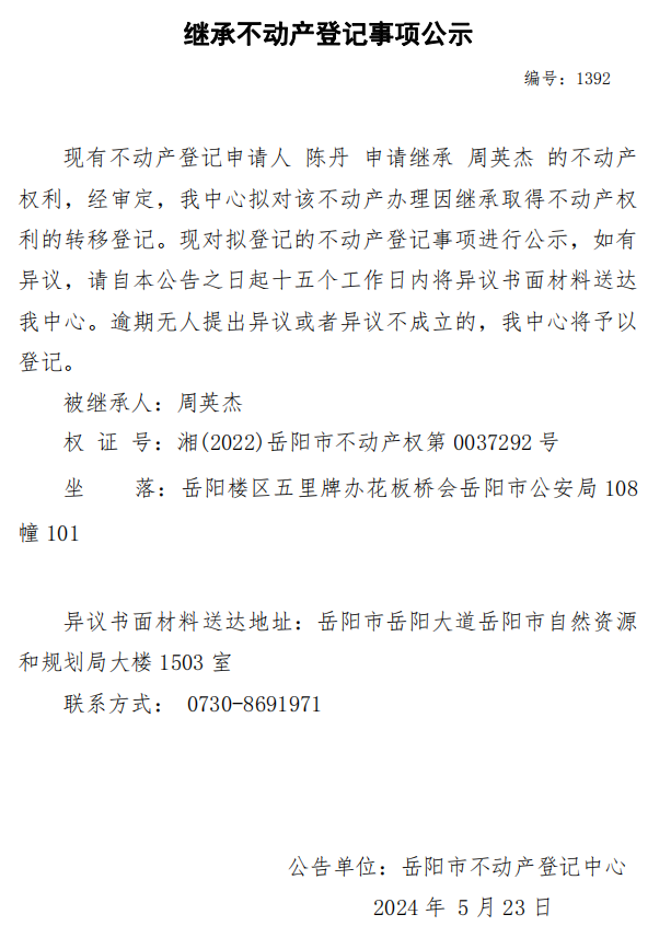 继承不动产登记公示 编号:陈丹(1392)