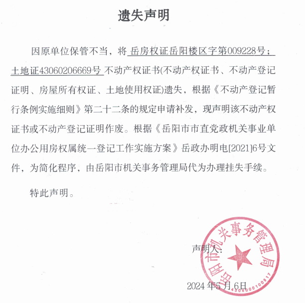 遗失声明 (岳阳市机关事务管理局)