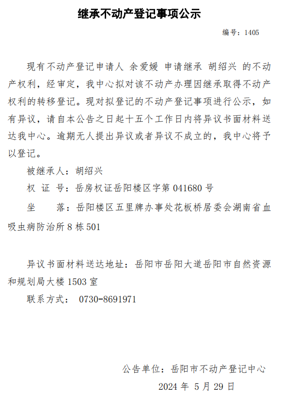 继承不动产登记公示 编号:余爱媛(1405)