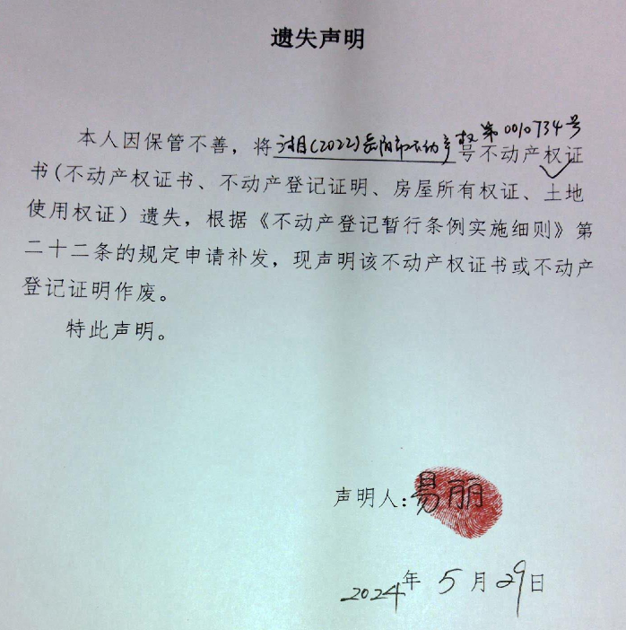 遗失声明(易丽 )