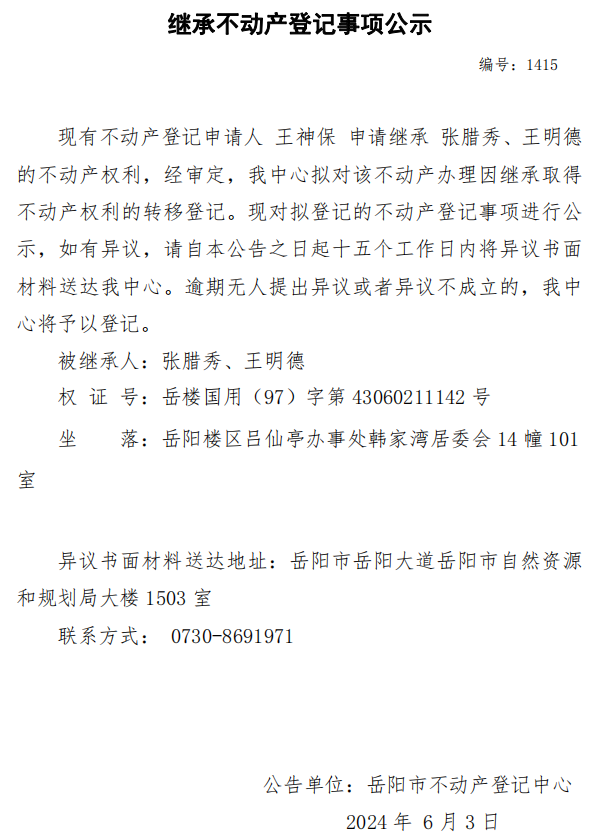 继承不动产登记公示 编号:王神保(1415)
