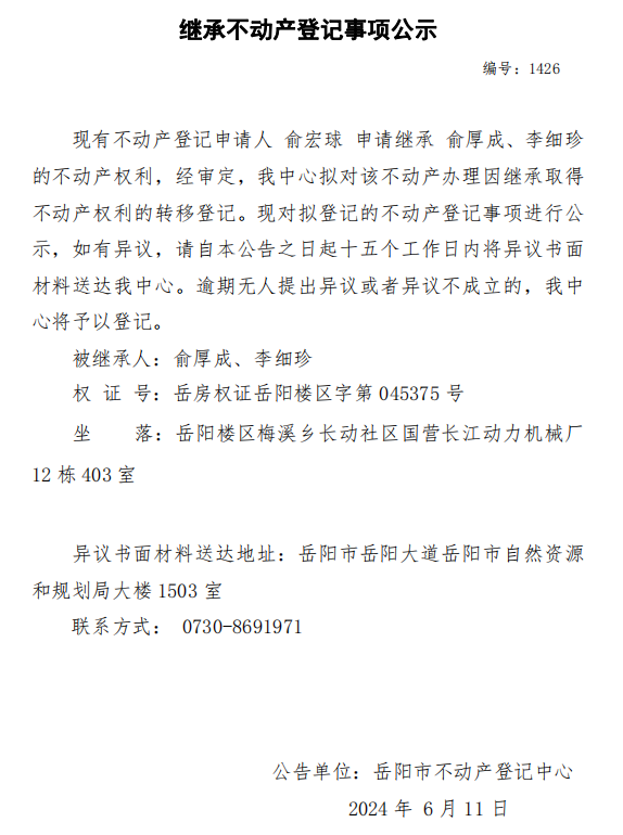 继承不动产登记公示 编号:俞宏球(1426)
