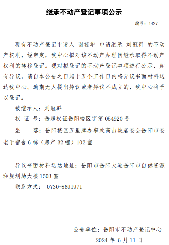继承不动产登记公示 编号:谢毓华(1427)