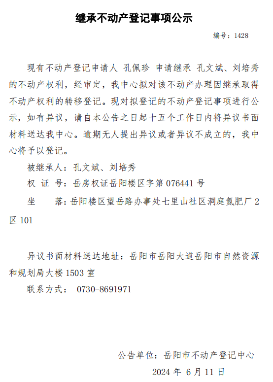 继承不动产登记公示 编号:孔佩珍(1428)
