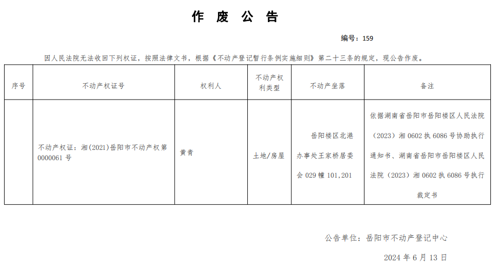 作废公告 编号:黄青(159)