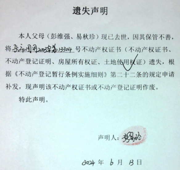 遗失声明(彭易玲)