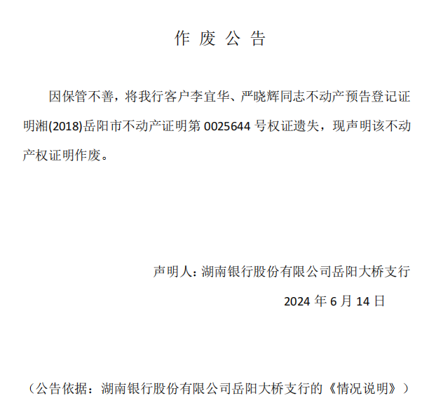 作废公告(湖南银行股份有限公司岳阳大桥支行)