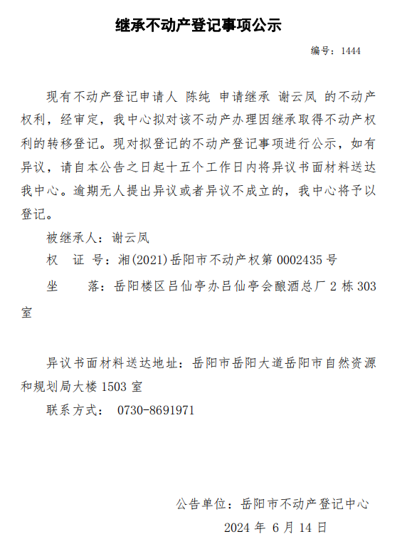 继承不动产登记公示 编号:陈纯(1444)