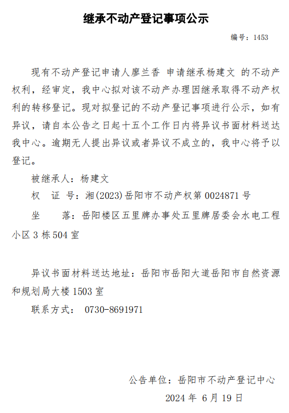 继承不动产登记公示 编号:廖兰香(1453)