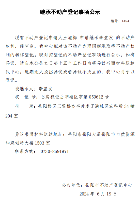 继承不动产登记公示 编号:王旭梅(1454)