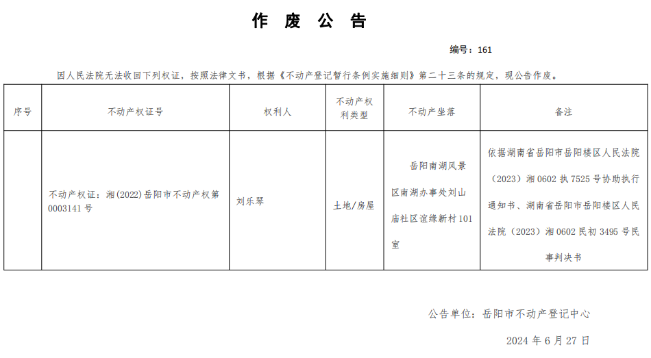 作废公告 编号:刘乐琴(161)
