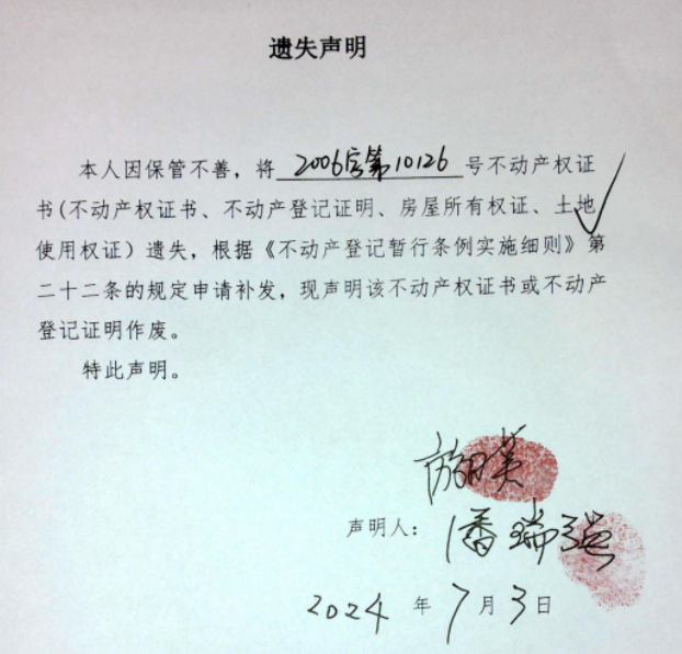 遗失声明(潘瑞强、游月英)