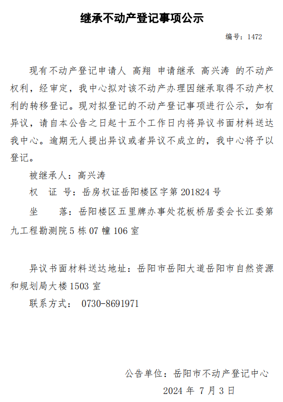 继承不动产登记公示 编号:高翔(1472)