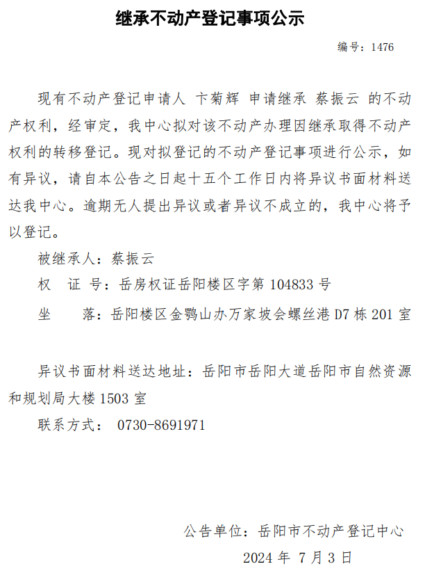 继承不动产登记公示 编号:卞菊辉(1476)