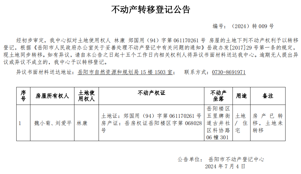 不动产转移登记公告 编号:(2024)转009(林康)