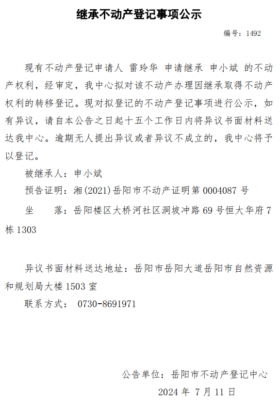 继承不动产登记公示 编号:雷玲华(1492)