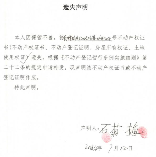 遗失声明(石菊梅)