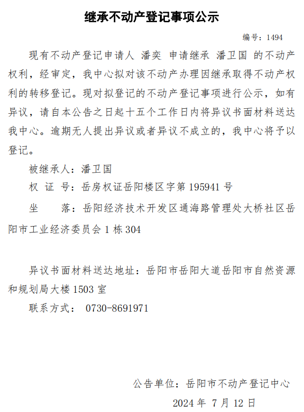 继承不动产登记公示 编号:潘奕(1494)