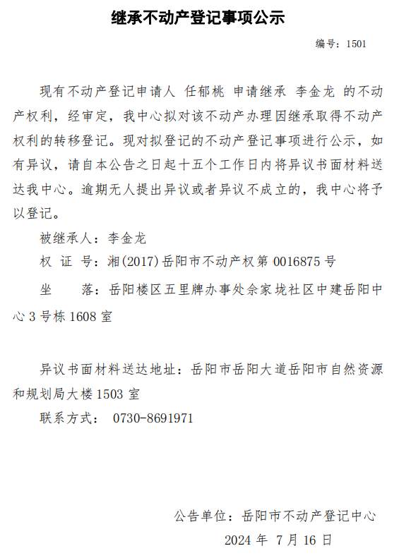 继承不动产登记公示 编号:任郁桃(1501)